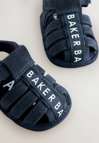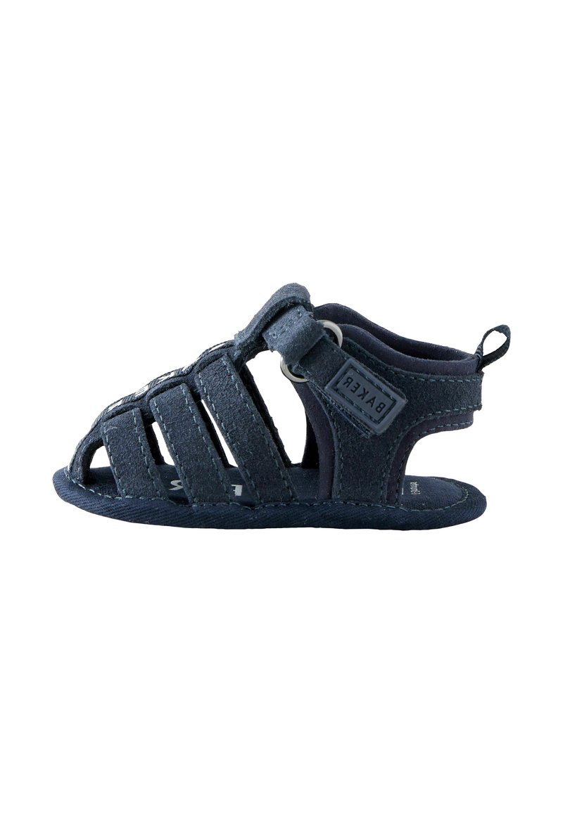 Tengerészkék, nyitott orrú baba szandál puha talppal, állítható csattal ellátott pánttal és oldalon márkajelzéssel.