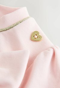 Rózsaszín hosszú ujjú ruha puha anyagból, masni díszítéssel a mellrészen és arany szegéllyel a nyakkivágásnál és az ujjvégben. A ruha bővülő szabású.
