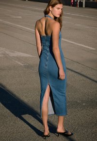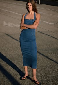 Keresztbe tett karokkal álló nő kék, ujjatlan farmerruha középmagas hosszban és fekete papucsban, napfényes, burkolt talajon.