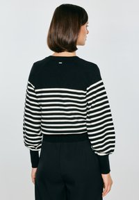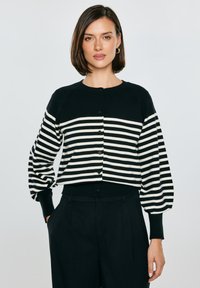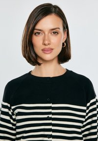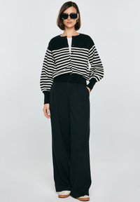 Rövid barna hajú nő fekete-fehér vízszintes csíkos kardigánban és fekete magas derekú nadrágban, egyik kezét a zsebében tartva áll.