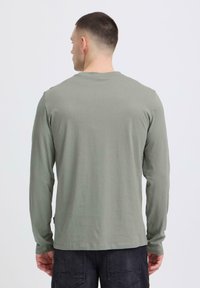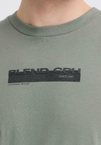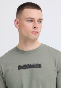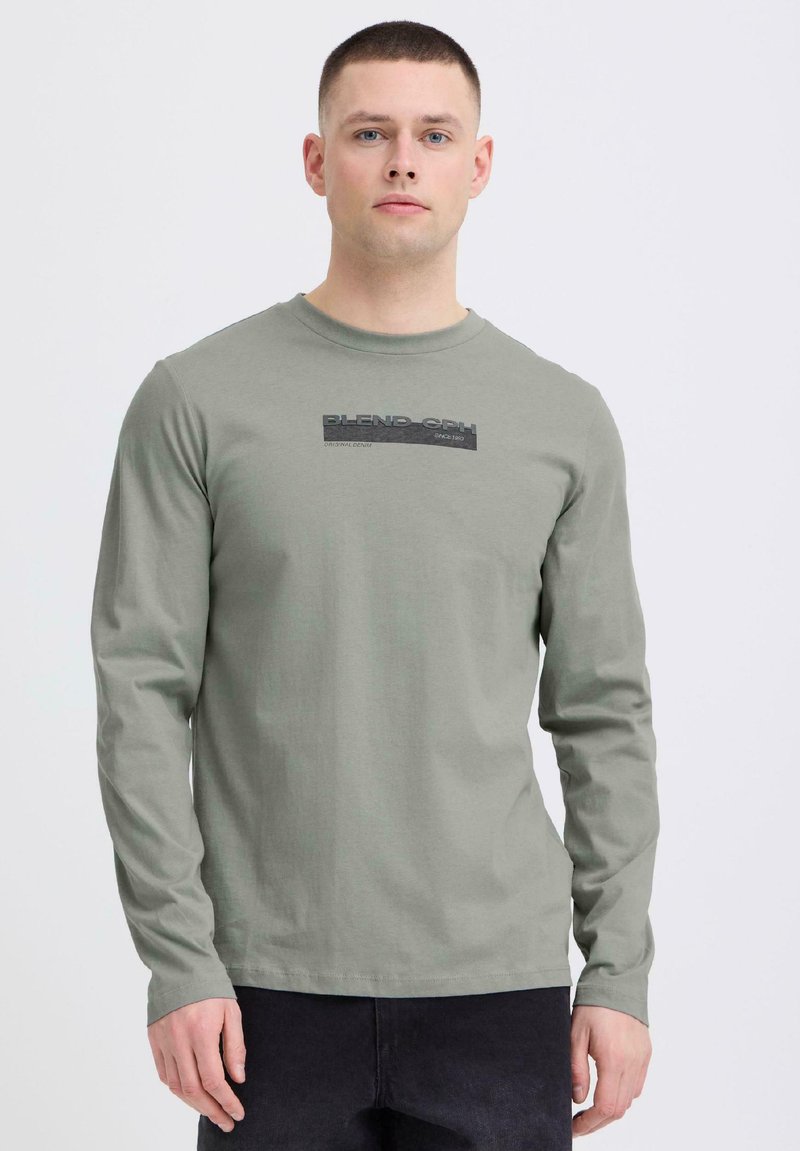Férfi világosszürke hosszú ujjú pólóban, amelyen a "BLEND CPH" logó látható a mellkasán, sima fehér háttér előtt áll.
