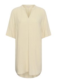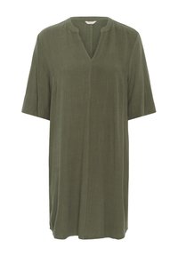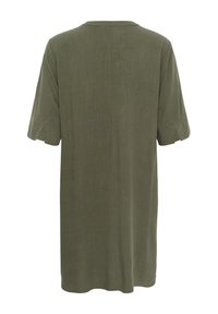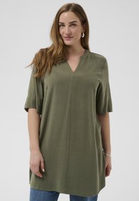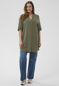Nő hosszú barna hajjal, olívazöld, V-nyakú és fél ujjú tunikát visel kék farmernadrág felett, egyszínű háttér előtt áll.