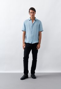 Fiatal férfi rövid sötét hajjal, világoskék, rövid ujjú gombos ingben és fekete nadrágban, zsebeibe dugott kézzel áll.