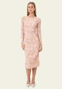 Virágmintás midi ruha hosszú ujjakkal, világosszürke alapszínnel, rózsaszín és narancssárga virágmintákkal, valamint bordázott textúrával.