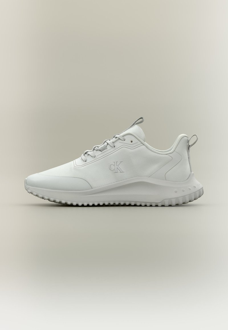 Fehér, alacsony szárú sportcipő texturált talppal, fűzővel az elején, és „cK” logóval az oldalon, oldalnézetben neutrális háttéren.