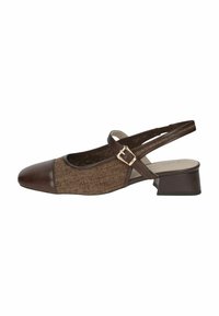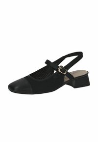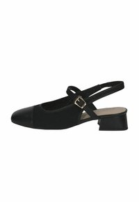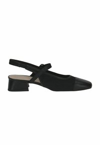 Fekete slingback cipő texturált szövet felsőrésszel és fényes lakk orrkappal. Alacsony blokk sarokkal és oldalsó csatos pánttal rendelkezik.