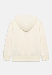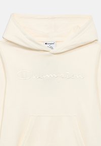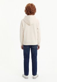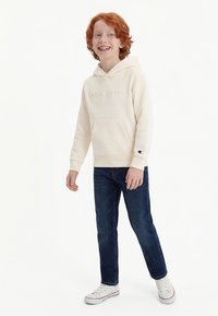 Mosolygós vöröshajú gyermek krémszínű Champion kapucnis pulóvert, sötétkék farmert és fehér tornacipőt viselve, fehér háttér előtt állva.