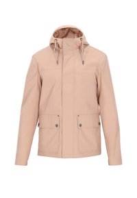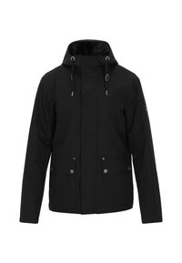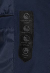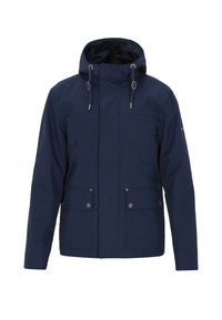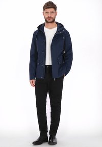 Tengerészkék vízálló dzseki kapucnival, elülső cipzárral, két nagy gombos zsebbel és állítható húzózsinórokkal. Simább textúra és testhezálló szabás.