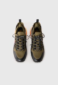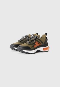 Fekete és olívazöld sportcipő narancssárga légpárnázással, fűzőkkel, logózott részletekkel és egy texturált talppal a tapadás érdekében.