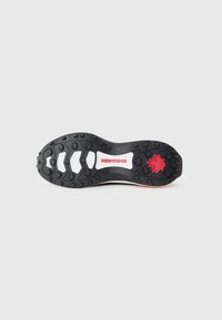 Fekete sportcipő talp multidirekcionális mintázattal, fehér díszítéssel és piros részletekkel. Különféle pöttyökkel van ellátva a tapadás érdekében.