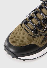 Oliva zöld sportcipő fekete díszítéssel, hálós felsőrész, texturált felület, vastag fehér talp, és beépített fekete fűzőkkel, logó részletekkel.