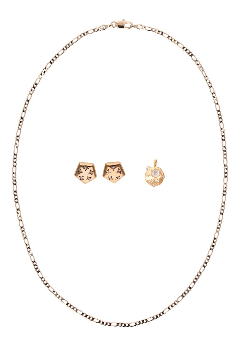 Arany lánc nyaklánc kapoccsal, párosítva pentagon alakú arany bedugós fülbevalókkal és egy hozzáillő arany medállal, melybe kis gyémántokat foglaltak.