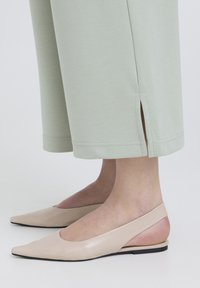 Nő világoszöld, bőszárú nadrágban, kezét lazán oldalán tartva, fehér hosszú ujjú felsővel és bézs hegyes orrú cipővel párosítva.