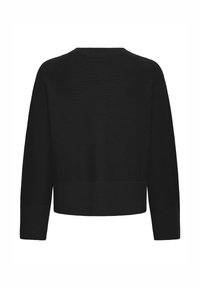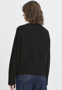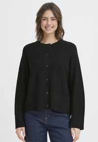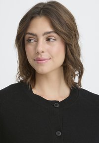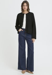 Fekete kardigán kerek nyakkivágással, elöl gombokkal és bordázott textúrával. Hosszú ujjú, laza szabású, sötétkék farmerral párosítva.