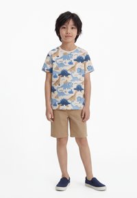Fiú bézs, dinoszaurusz mintás pólóban, világosbarna rövidnadrágban és tengerészkék színű, könnyen felhúzható cipőben, fehér háttér előtt állva.