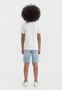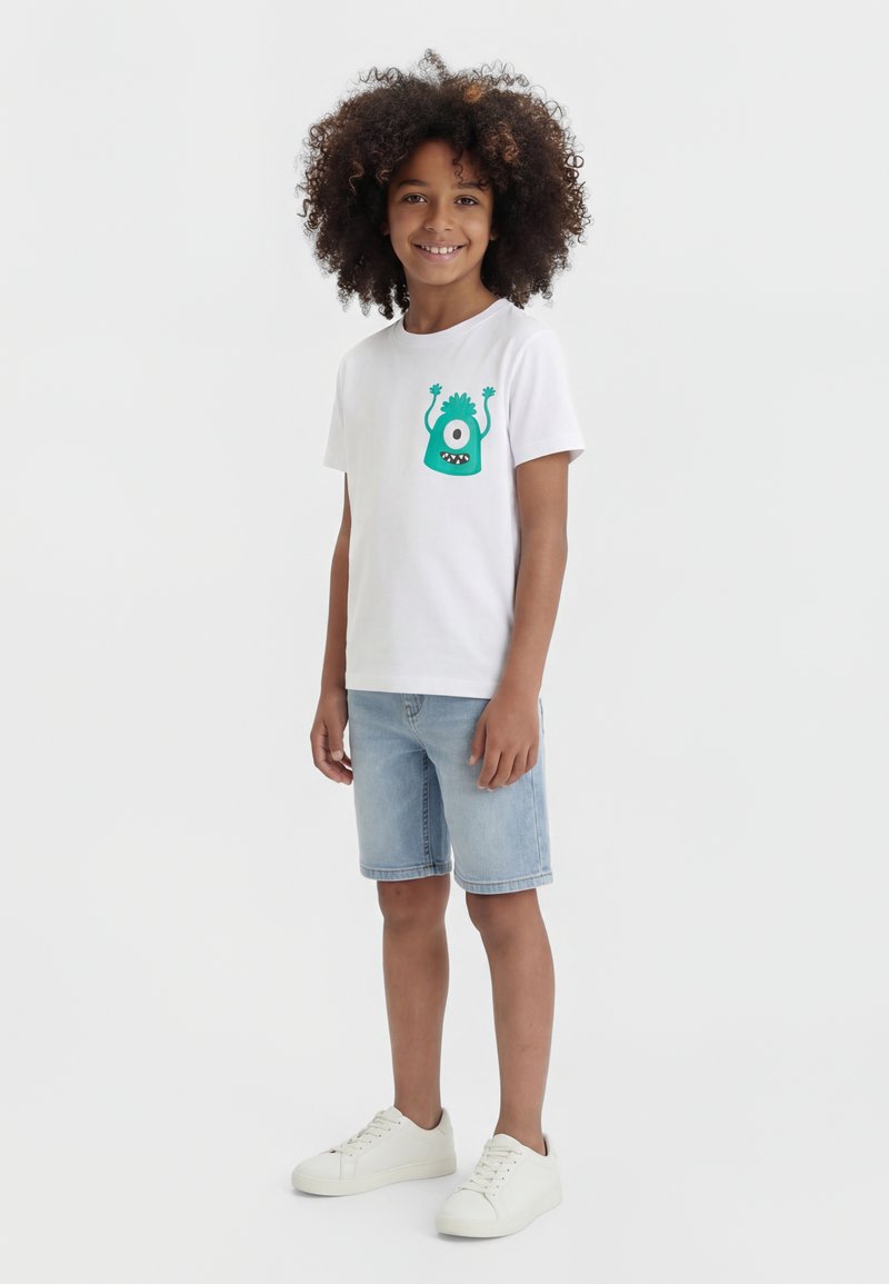 Göndör hajú gyerek, fehér pólót visel, amelyen zöld egyszemű szörny van, világos farmer rövidnadrágot és fehér tornacipőt, áll és mosolyog.