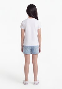 Mosolygó lány hosszú sötét hajjal, fehér pólót, világoskék farmer rövidnadrágot és fehér tornacipőt visel, az egyik kezét a zsebébe téve áll.
