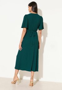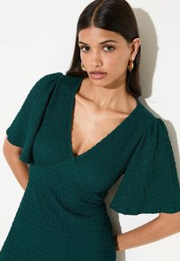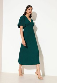 Zöld, texturált midi ruha V-nyakú kivágással és fodros ujjal, testhezálló szabással és oldalsó sliccel, arany pántos magassarkúval párosítva.