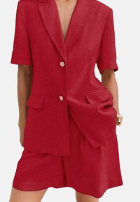 Nő világos rózsaszín, testre szabott blézerben arany gombokkal és hozzáillő, magas derekú rövidnadrágban, kezét a zsebében tartja, fehér háttér előtt.