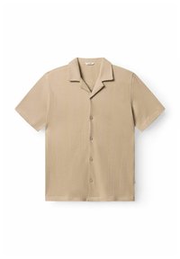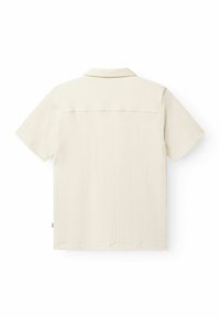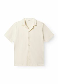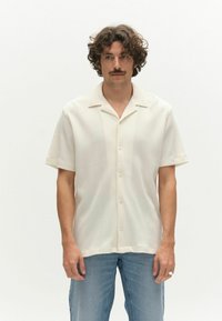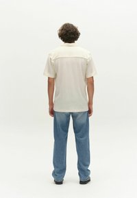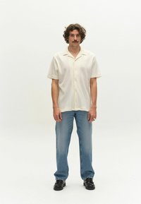 Göndör hajú és bajszos férfi rövid ujjú fehér, gombos ingben és világoskék farmernadrágban, egyszínű fehér háttér előtt áll.