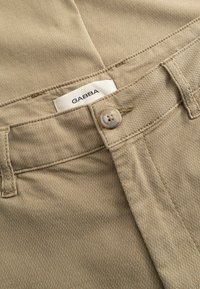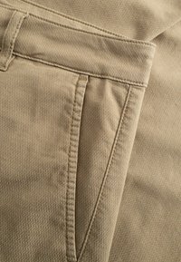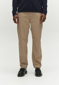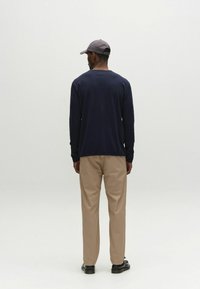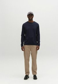 Férfi, bézs színű egyenes szárú nadrágban, fekete bojtos mokaszinban és sötét hosszú ujjú felsőben, egyszínű háttér előtt állva.