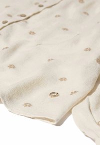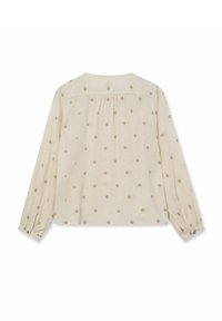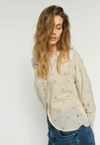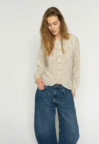 Hosszú hullámos hajú nő, krémszínű, apró virágmintás, gombos blúzban és laza kék farmerben, egyszínű háttér előtt állva.