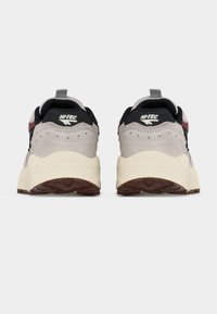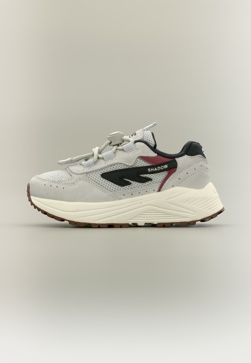 Világosszürke sportcipő fekete és bordó részletekkel, vastag fehér talppal, fekete "SHADOW" feliratos logóval és fűzőzáras megoldással, balra néz.