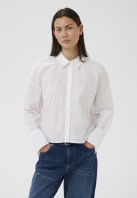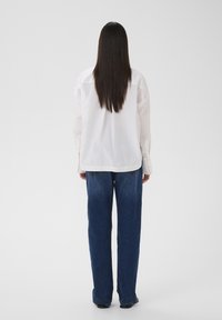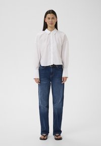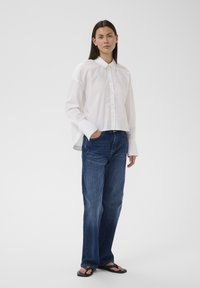 Fiatal nő egyenes sötét hajjal, laza fehér gombos ingben és kék farmernadrágban, zsebében a kezeivel, semleges háttér előtt.