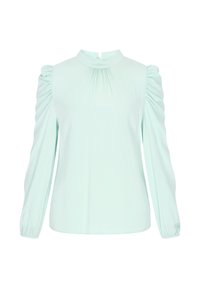 Zöld textúrájú blúz puffos ujjakkal, pöttyös mintával és rugalmas mandzsettákkal. Laza fazon, kerek nyakkivágással.