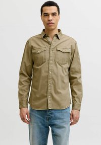 Rövid, göndör hajú férfi bézs színű, gombos, mellzsebes ingben és világoskék farmernadrágban, egyszínű fehér háttér előtt áll.