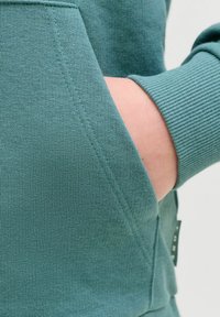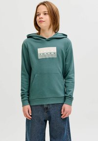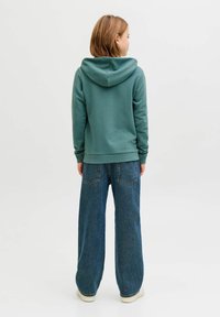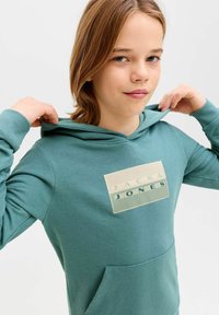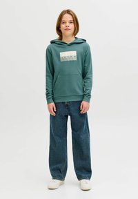 Fiatalember áll, zöld Jack & Jones kapucnis pulóvert, bő kék farmert és fehér tornacipőt visel világos, egyszínű háttér előtt.