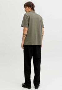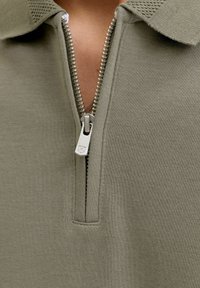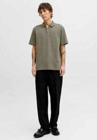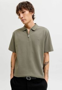 Fiatal férfi középhosszú hajjal, olívazöld rövid ujjú pólót visel, amelyen elöl cipzár van, és fekete nadrágot egy egyszerű háttér előtt.