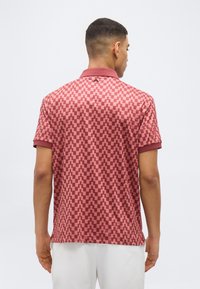 Férfi, aki piros és rózsaszín geometriai mintás galléros pólót visel bordó gallérral és fehér nadrággal, zsebébe dugott kézzel áll.