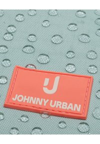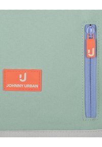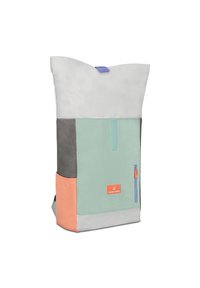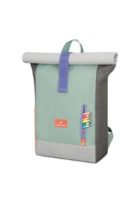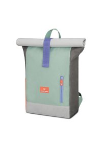 Zöld, feltekerhető hátizsák szürke díszítéssel, lila vállpánttal, narancssárga cipzáras zsebbel, és logóval az alján.