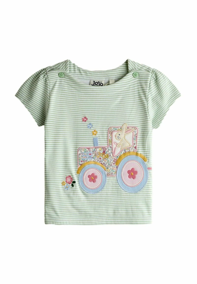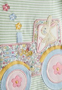 Világoszöld és fehér csíkos babaing vállán gombokkal, színes traktorral, rajta nyuszival és virágos díszítéssel.