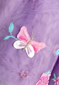 Lila ruha fodros ujjakkal, hímzett virág- és pillangómintákkal, bővülő szoknyával és puha, texturált anyaggal.