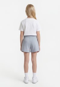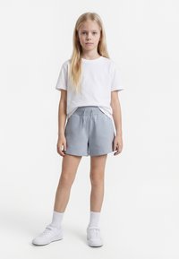 Fiatal lány áll, fehér pólót, szürke zsinóros rövidnadrágot, fehér zoknit és fehér tornacipőt visel, egyszínű háttér előtt.