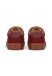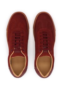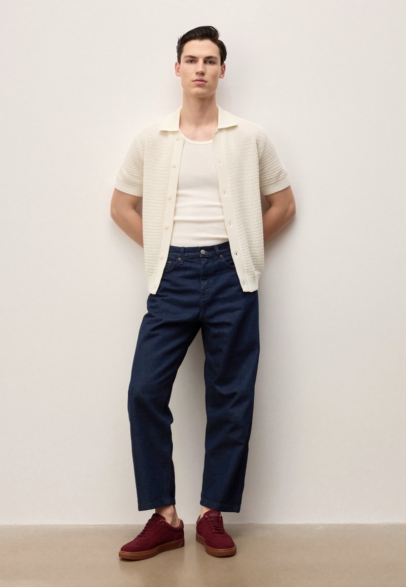 Fiatal férfi áll a falnak támaszkodva, fehér kötött rövid ujjú inget, fehér trikót, sötétkék farmert és piros gumitalpú tornacipőt viselve.