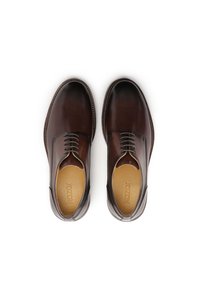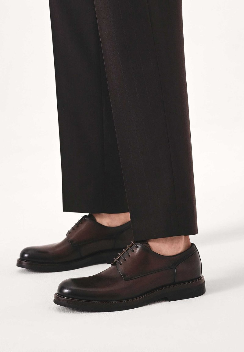 A kiváló minőségű természetes bőrből készült barna férfi derby félcipő ideális választás a smart casual szettekhez vagy a hétköznapibb öltözetekhez. A bőr gondosan kezelt, tapintásra puha, természetes textúrája pedig mélységet és karaktert ad a cipőnek. A barna szín melegséget és sokoldalúságot kölcsönöz, jól illik a különféle öltönyök, chino nadrágok vagy farmerek számos árnyalatához. Ez a modell nyitott orrú, ami nagyobb kényelmet és könnyebb illeszkedést biztosít a lábnak. A modell egyediségét a kétszínű talp adja, amely modern megjelenést kölcsönöz a cipőnek, míg a finom varrások és az orr lekerekített formája kiemelik a kézműves kidolgozást.
