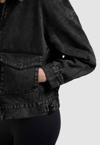 Nő fekete, mosott farmerdzsekit visel, amelyen két nagy első zsebfedél található, egy egyszerű világosszürke háttér előtt áll.