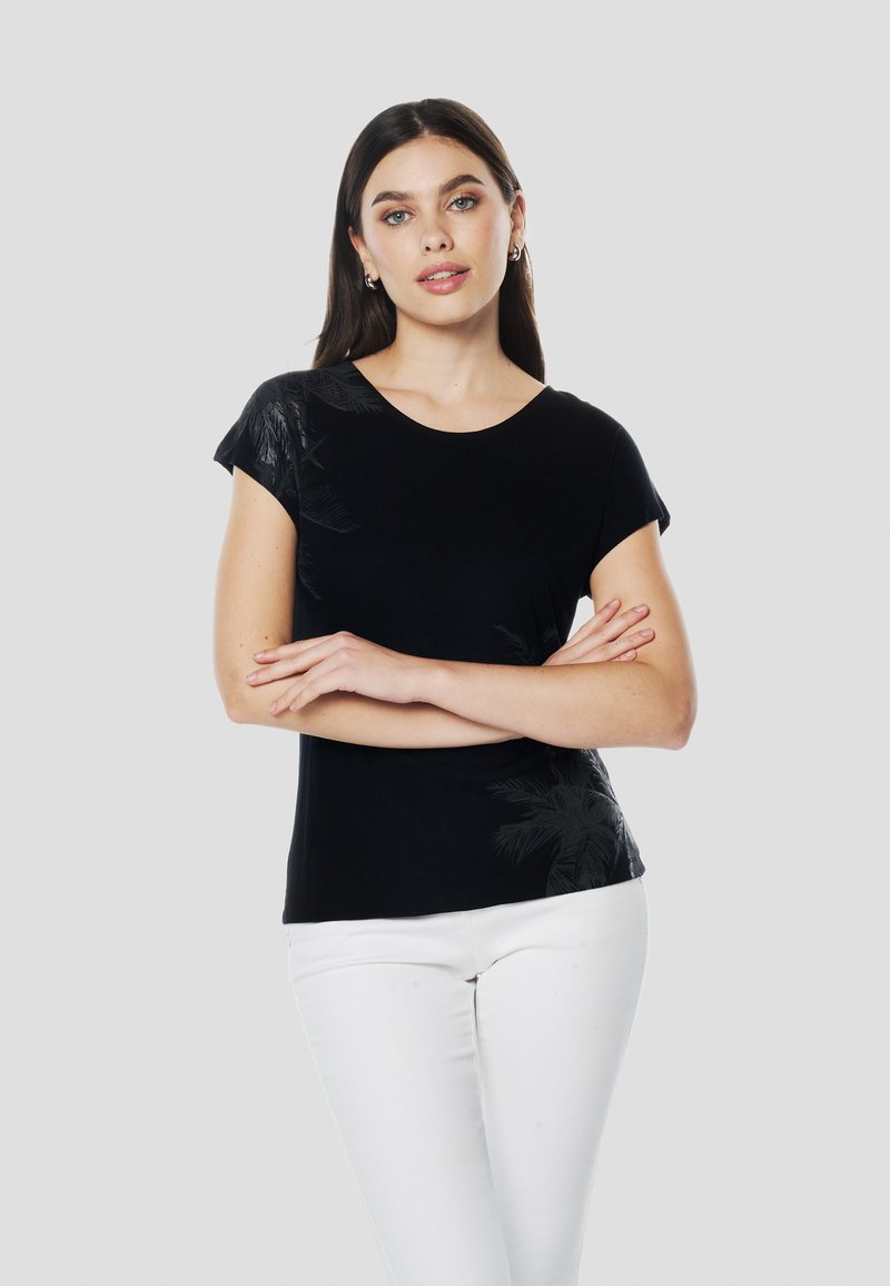 Fekete, rövid ujjú felső, bal oldalon texturált pálmalevél mintával. Párosítsd fehér, testhezálló nadrággal a kontrasztért. Simogató anyag, lekerekített nyakkivágás.
