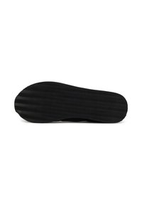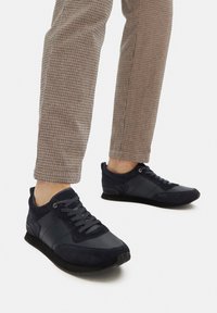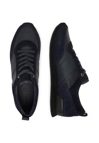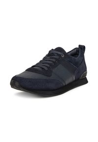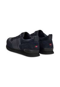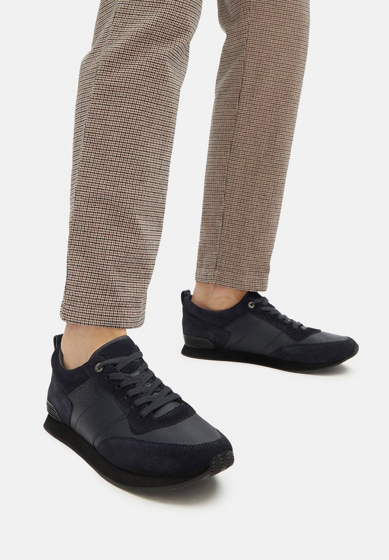 Sötétkék sportcipő, amely velúr és sima textil keverékéből készült, fűzős záródással és gumitalppal, kockás nadrággal párosítva.