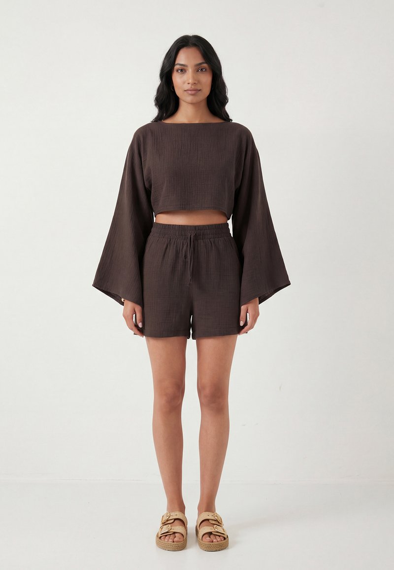Nő áll sötétbarna, laza, hosszú ujjú, rövid felsőt és hozzáillő rövidnadrágot visel bézs szandállal, egyszerű fehér háttér előtt.