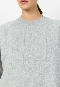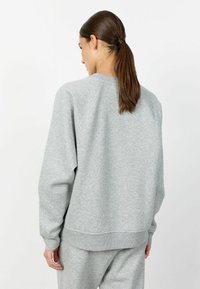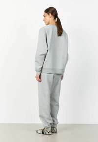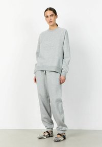 Barna haját hátrafogva viselő nő világosszürke pulóvert és hozzáillő szürke melegítőnadrágot visel, fehér háttér előtt áll.
