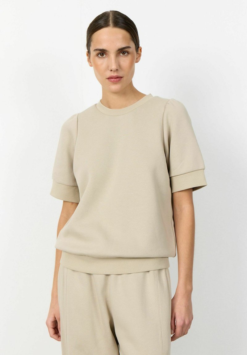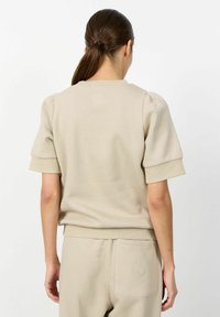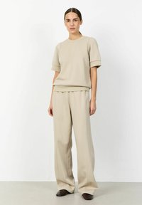 Sötét hajú nő bézs színű rövid ujjú pulóverben és hozzáillő nadrágban, egyszínű fehér háttér előtt állva.