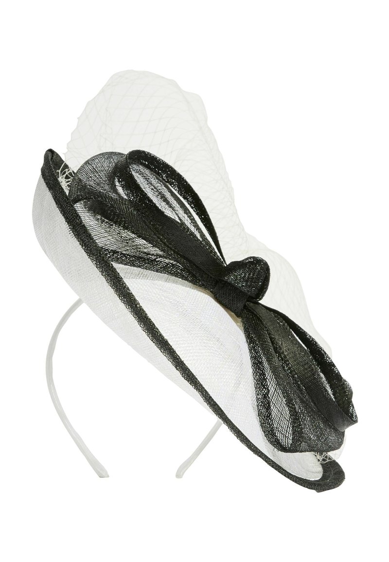 Fehér fascinator kalap fekete szegéllyel, fekete masnival és fehér hálóval, amely egy hajpántra van erősítve.