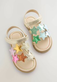 Gyermek bézs szandál három pánttal, melyeket rózsaszín, lila, arany és narancssárga csillámló csillag díszek díszítenek, és tépőzáras boka pánttal rendelkezik.