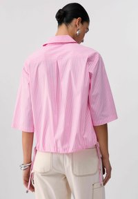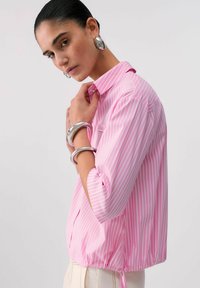 Hölgy hátrafésült hajjal, ezüst karika fülbevalókat visel, rózsaszín-fehér csíkos, gombos ingben és világos bézs nadrágban, kezét zsebre dugva.