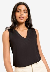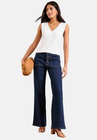 Nő tengerészkék-fehér csíkos ujjatlan felsőben és krémszínű nadrágban, aki egy kis barna bőr vödörtáskát tart a fogójánál.