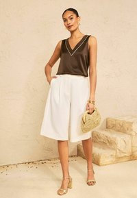 Nő ujjatlan barna, világos varrású V-nyakú felsőben, nagy arany fülbevalókkal és fehér nadrágban, kezét zsebében tartva, jobbra néz.